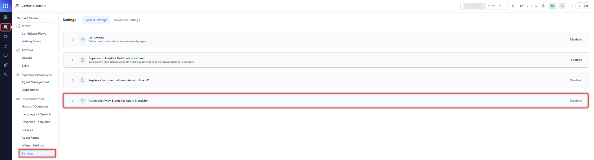 This feature adds a configurable option to automatically set an agent’s status to Away when the configured Agent Inactivity Wait Time is breached after a conversation becomes overdue. This prevents inactive agents from receiving new interactions and ensures accurate routing.
