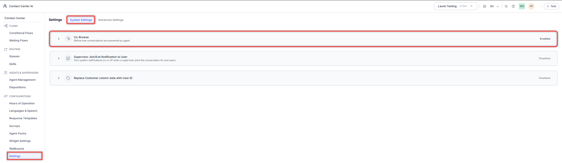 - Go to Contact Center AI > CONFIGURATIONS > Settings > System Settings > Co-Browse.