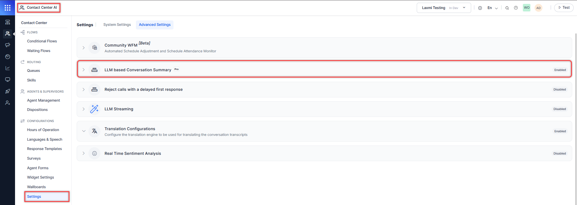 Go to Contact Center AI > CONFIGURATIONS > Settings > Advanced settings > LLM based Conversation Summary.