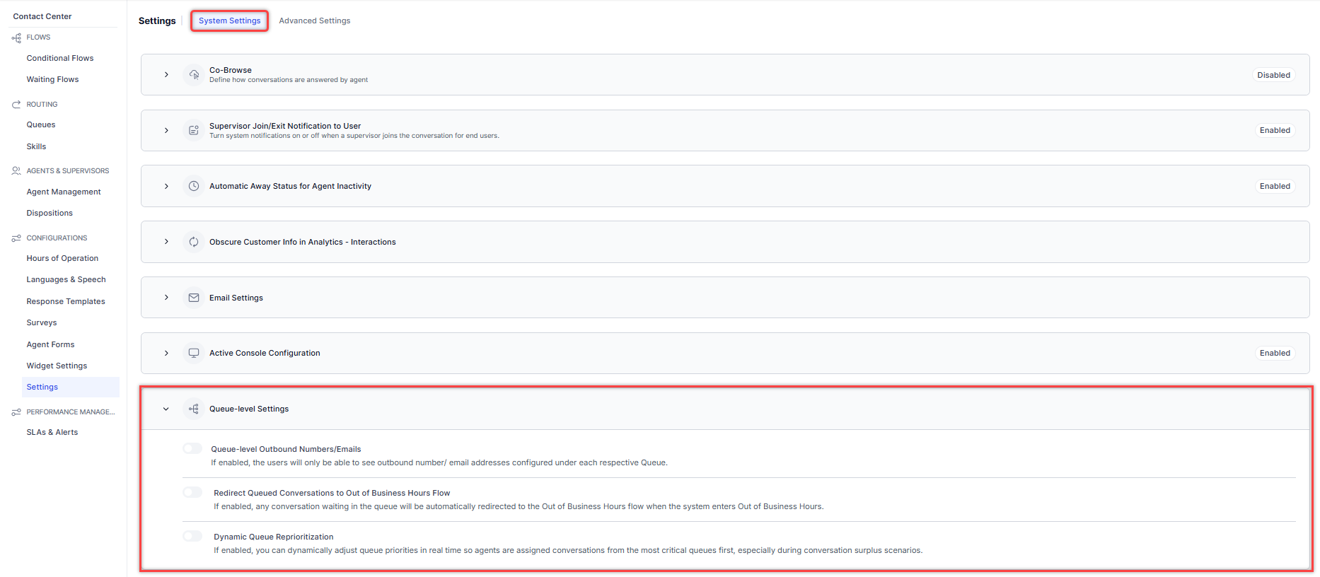 Navigate to Contact Center AI > Configurations > Settings > System Settings > Queue-level Settings.