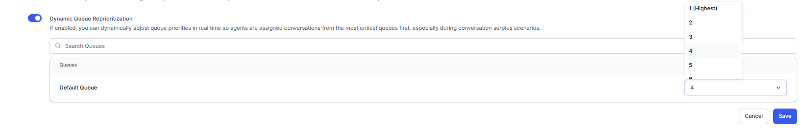 Dynamic Queue Reprioritization: When the toggle is on, administrators can dynamically adjust queue priorities in real time so that agents are assigned conversations from the most critical queues first, especially during conversation surpluses.