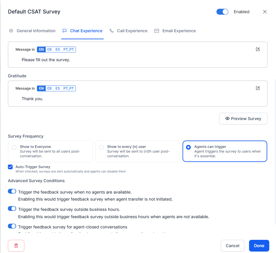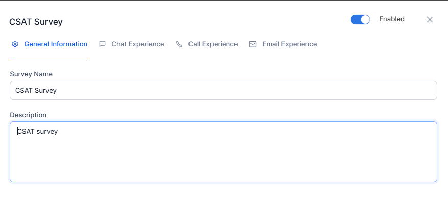 - Enable the Chat Experience, Call Experience, or Email Experience to request customers to take the survey.
