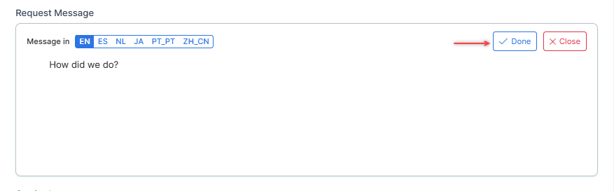Configure the Request Message and add a Gratitude Message that appears to customers before and after they take the survey. Choose the message language, type the message in, then select Done.