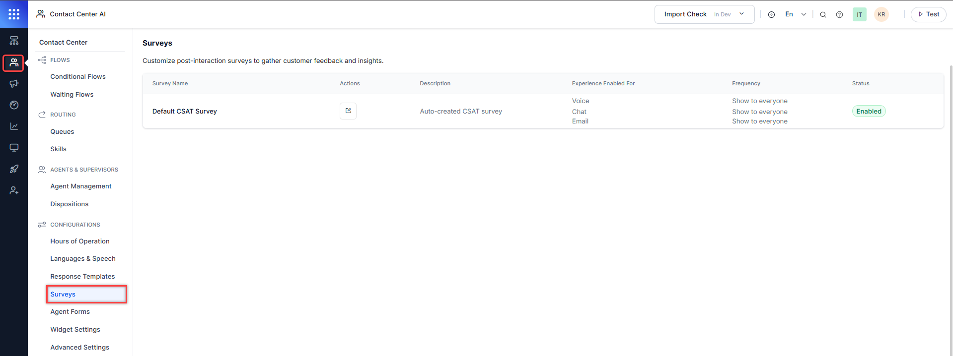 To access surveys, go to Contact Center AI > CONFIGURATIONS > Surveys.