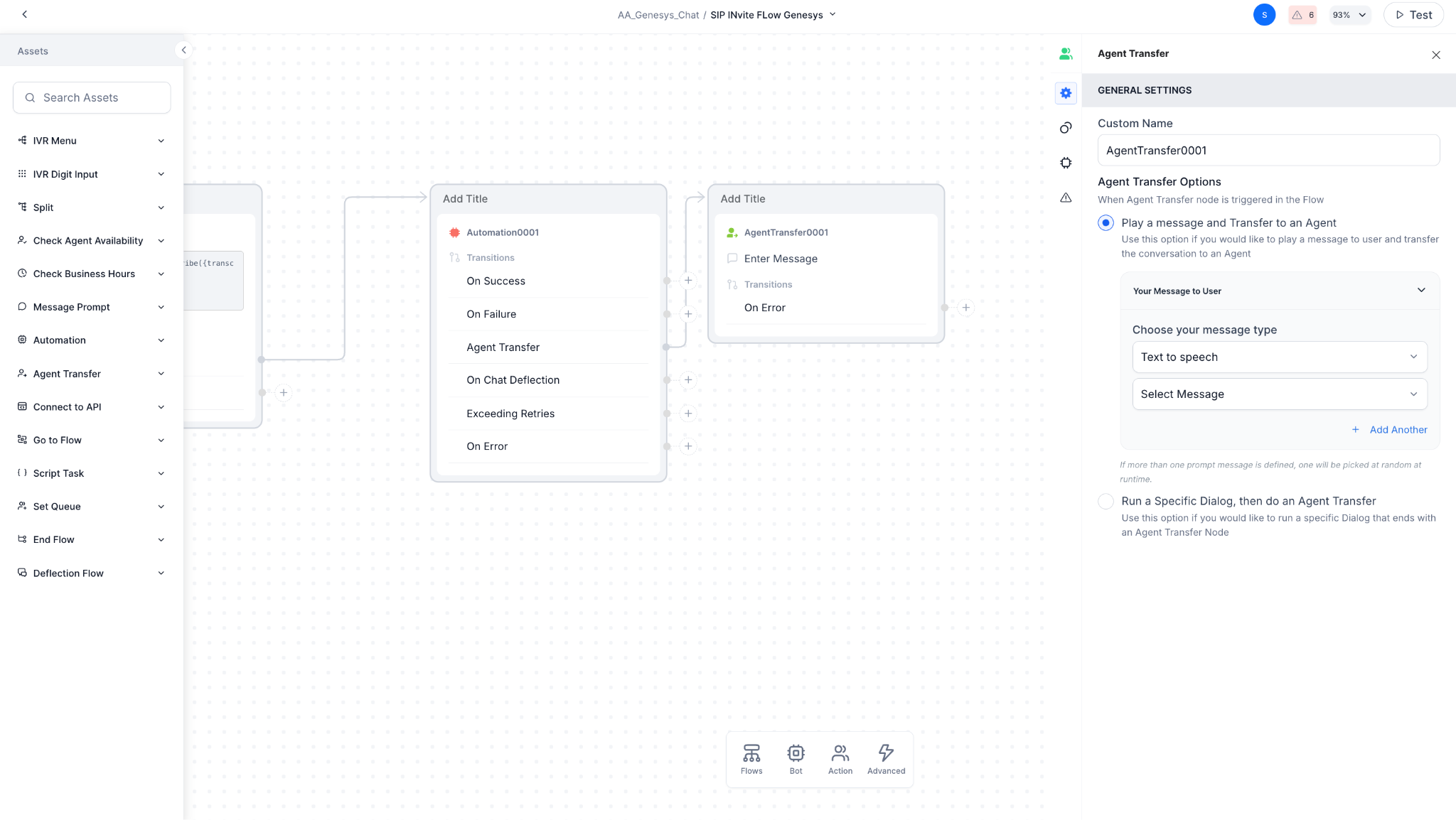 Add an Agent Transfer node in Experience Flow for handing over the call to Genesys agents.