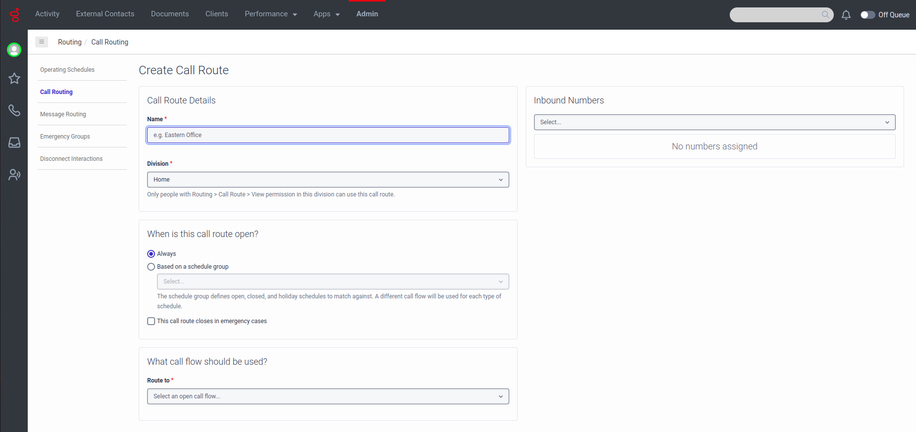 - Click Admin > Call Routing.