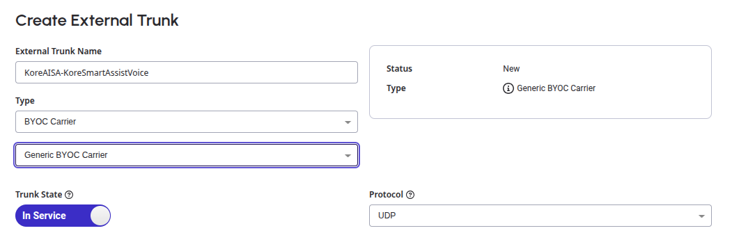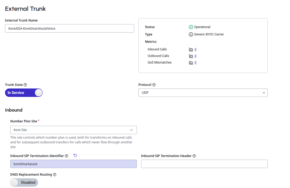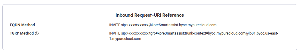 sip:+[12345678999@koreSmartassist.byoc.mypurecloud.comformat, where+12345678999is a DID number created in Genesys andkoreSmartassist.byoc.mypurecloud.comis the FQDN method of Genesys external trunk.Note