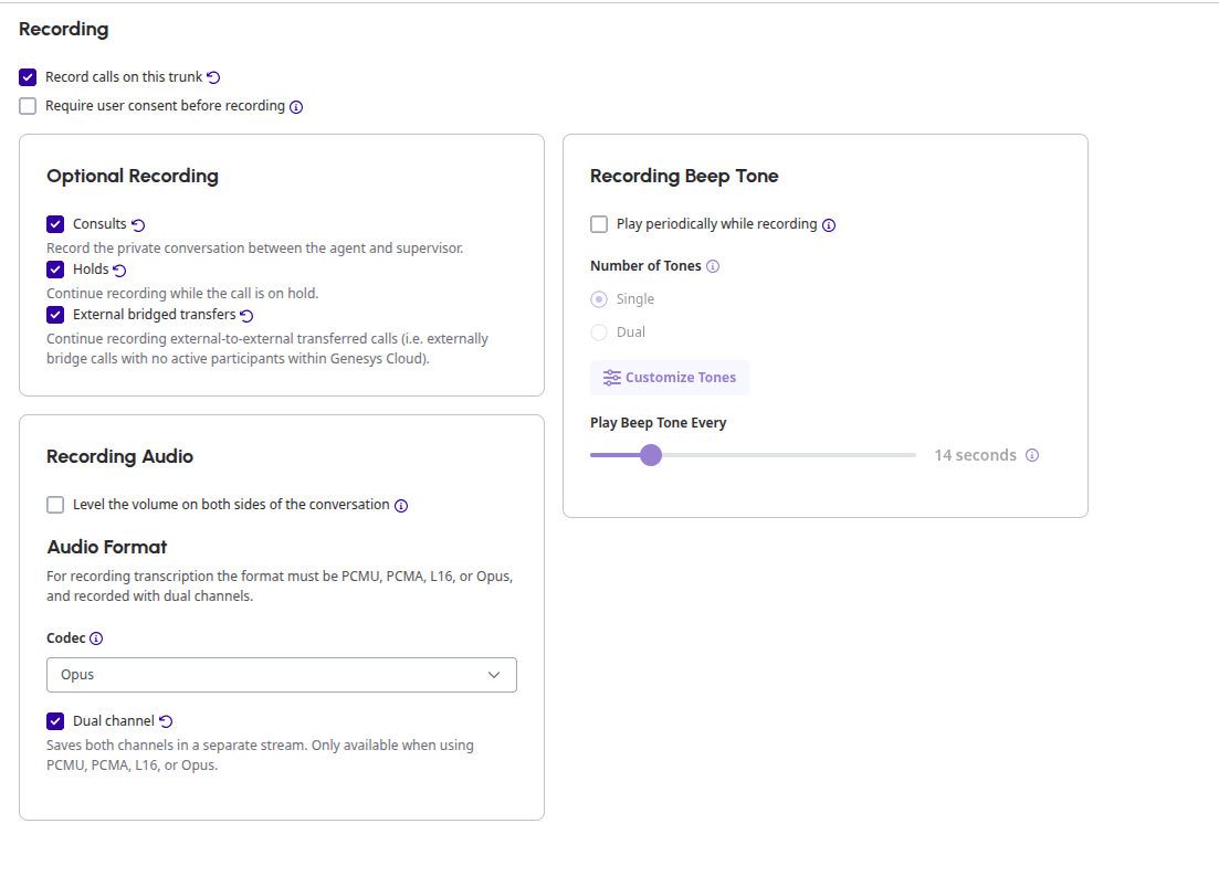 - If Media > Recording is not enabled in the external trunk, end call summary of the Agent AI widget will be unavailable, as the middleware requires this setting to receive the session end event from Genesys.