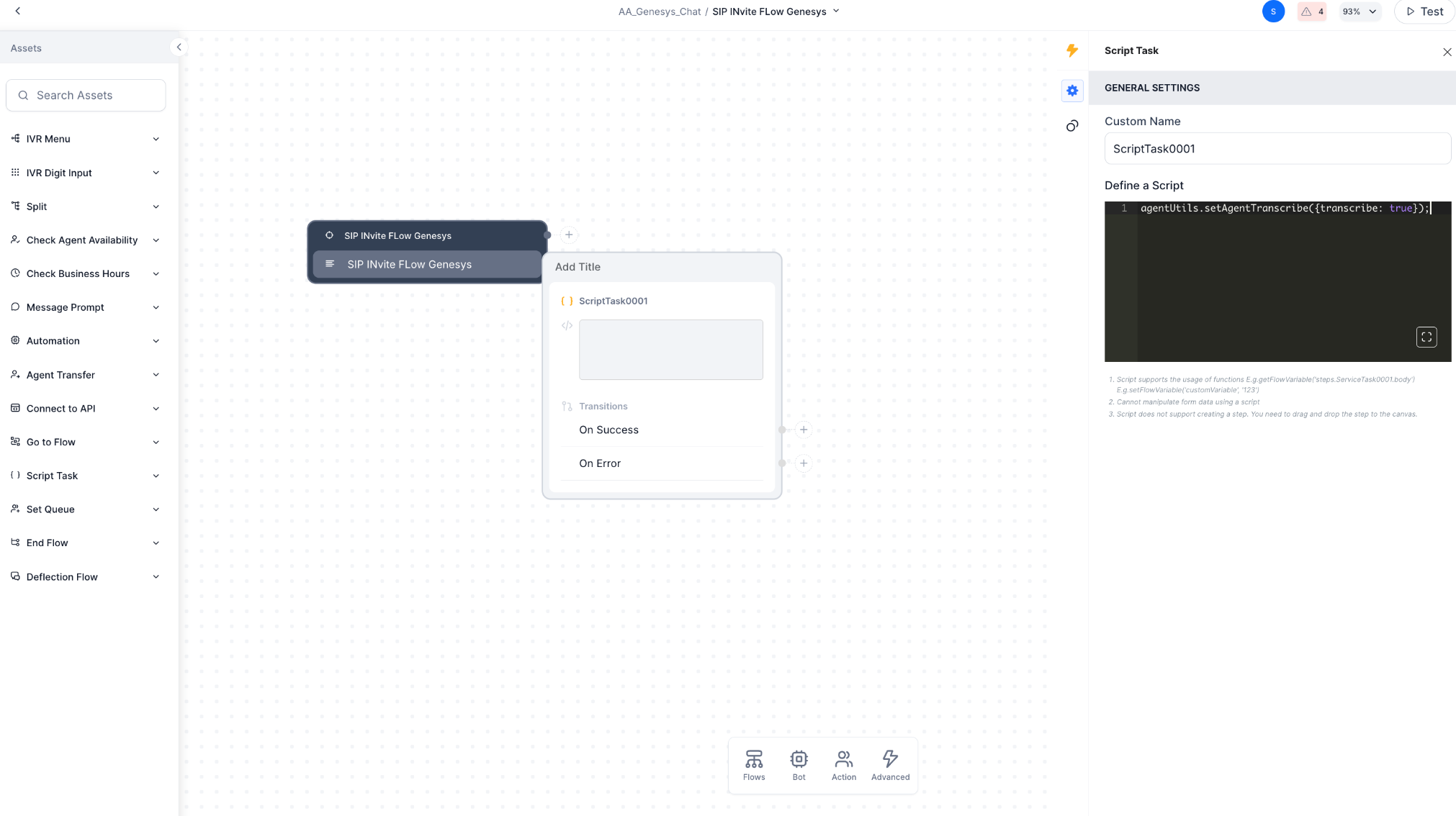 In Experience Flow, add a script node and add the “agentUtils.setAgentTranscribe({transcribe: true});” code.