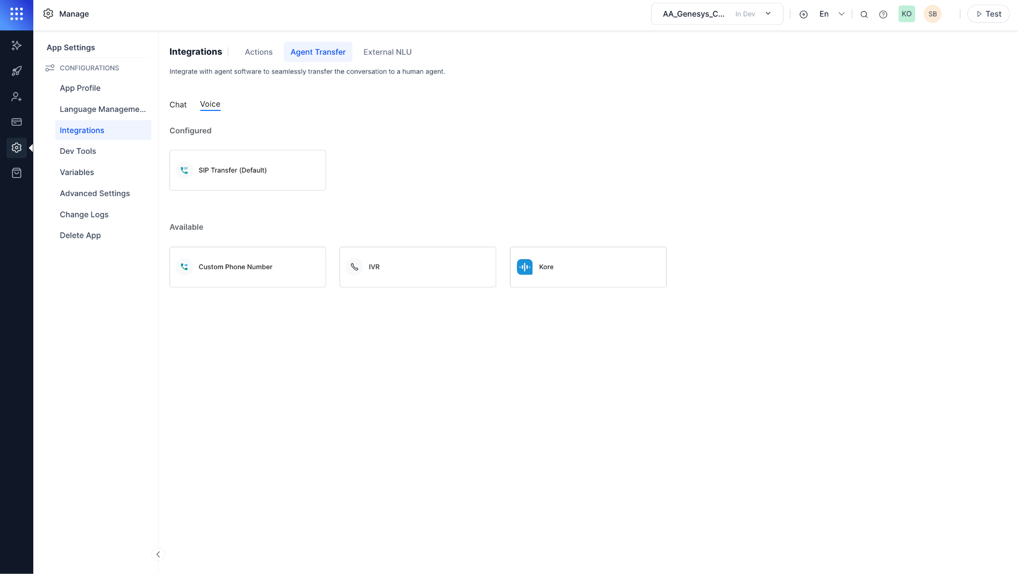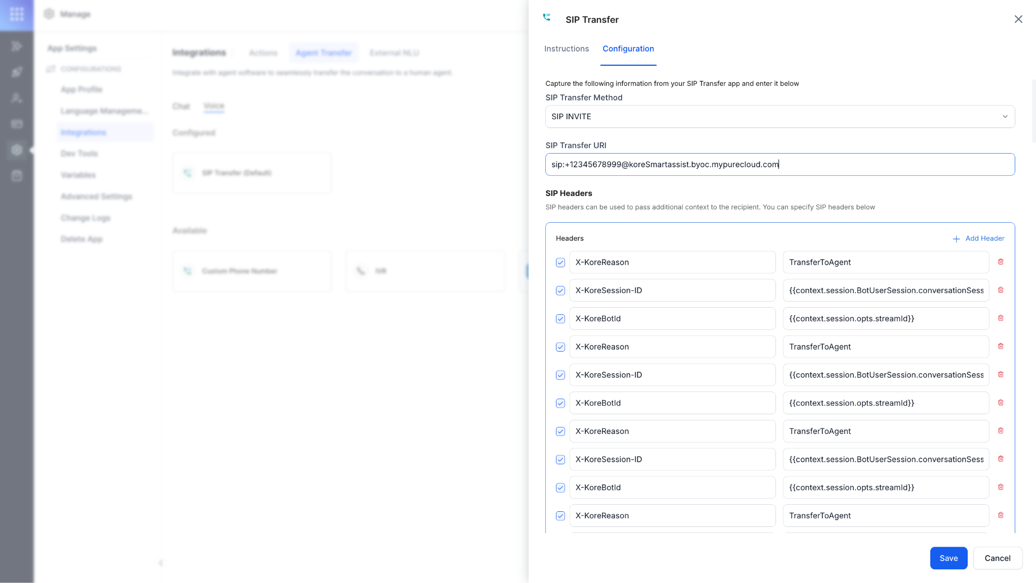 sip:+xxxxxxxxxxx@koreSmartassist.byoc.mypurecloud.com) to the Contact Center AI side Agent Transfer step. -