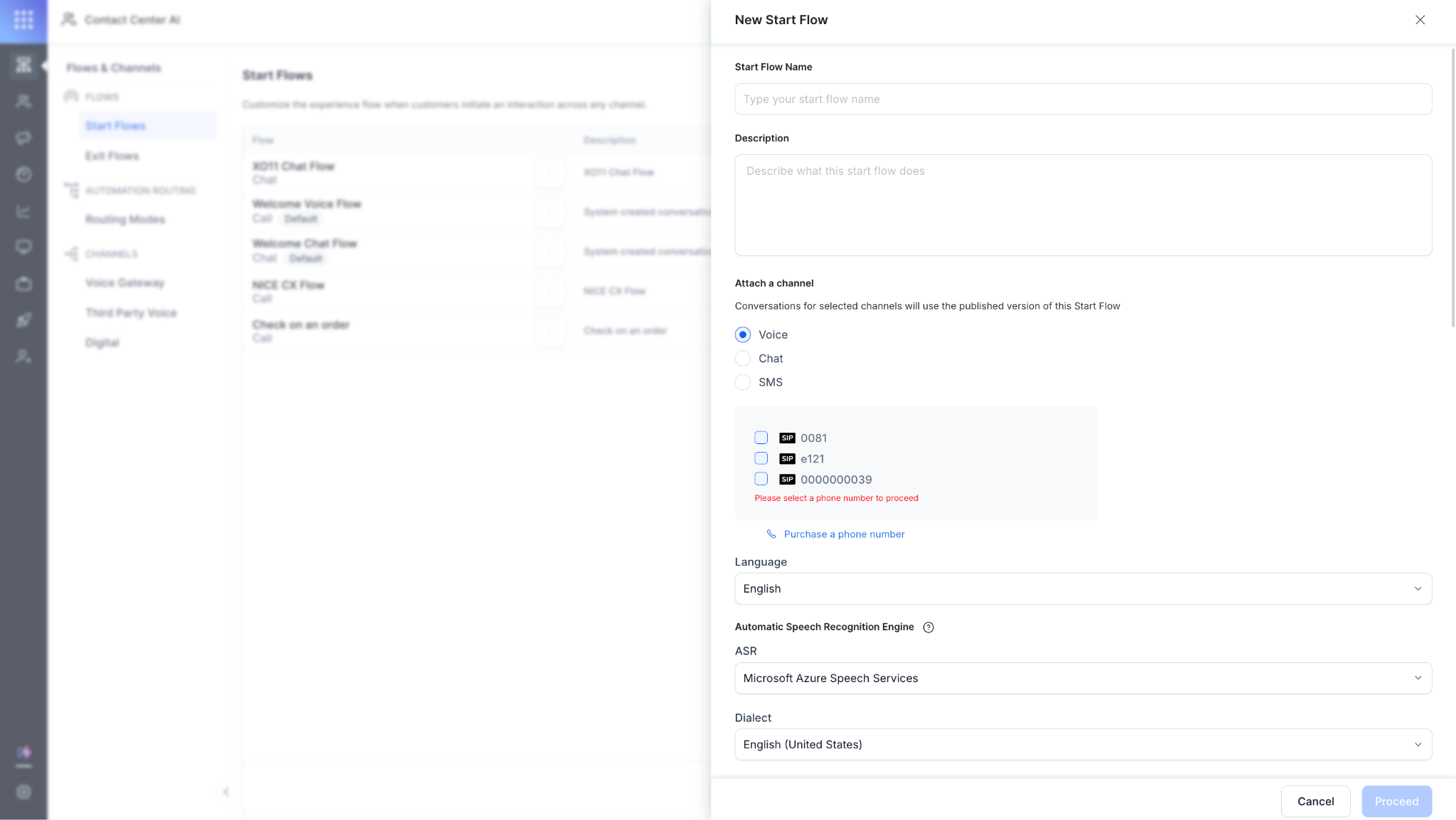 - Purchase a Phone Number in the Flows & Channels > Channels > Voice Gateway > Phone Numbers section, under CCAI.