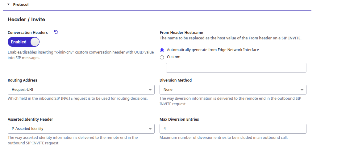 Using the SIP Invite method, you can pass these SIP headers to Genesys. Header keys must not contain spaces. Genesys allows reading up to 10 SIP headers using the Get SIP Header node in Architect/Callflow.