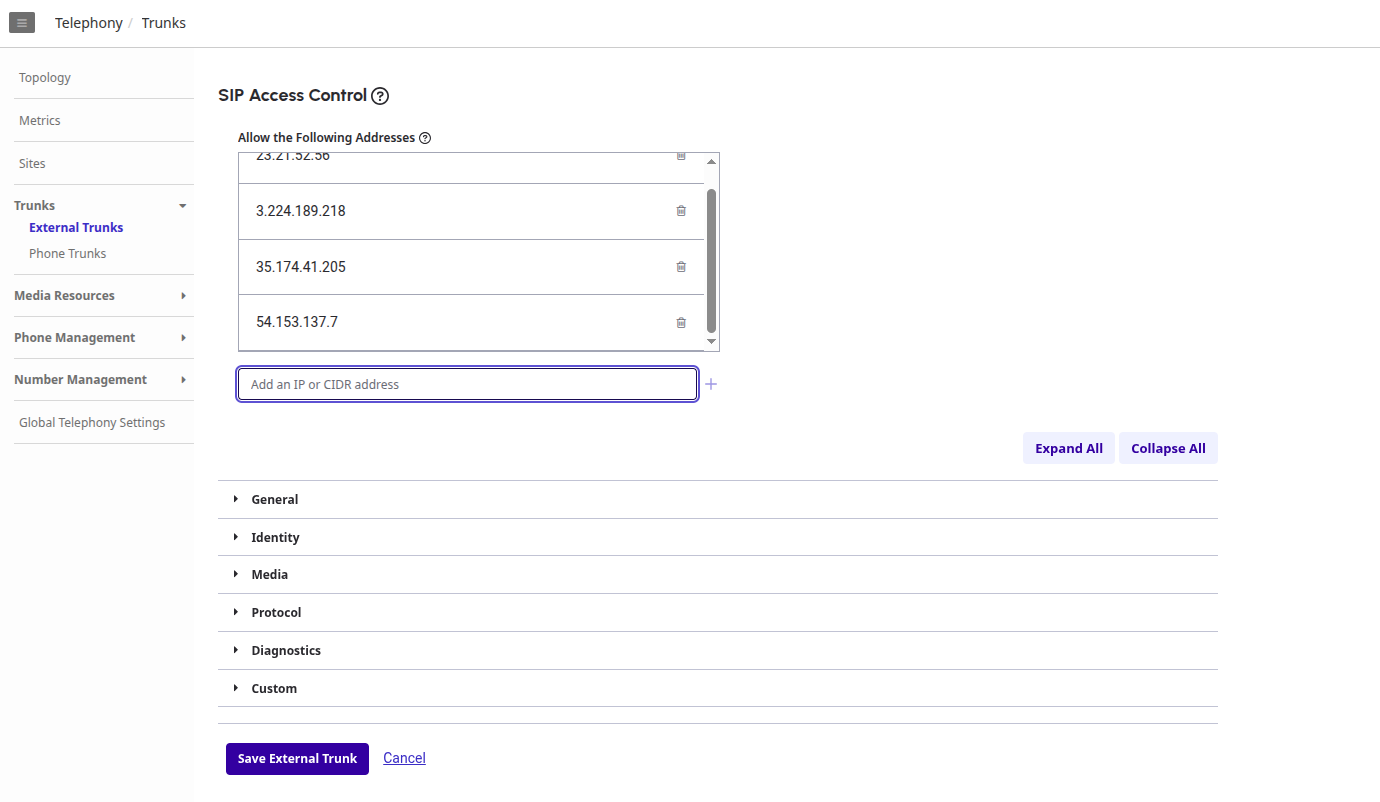 - Either search with External Trunks or click Telephony > External Trunks.