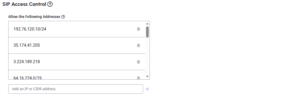 In the SIP Access Control field, add the AI for Service prod voice gateway IPs. This IP address varies based on the region: