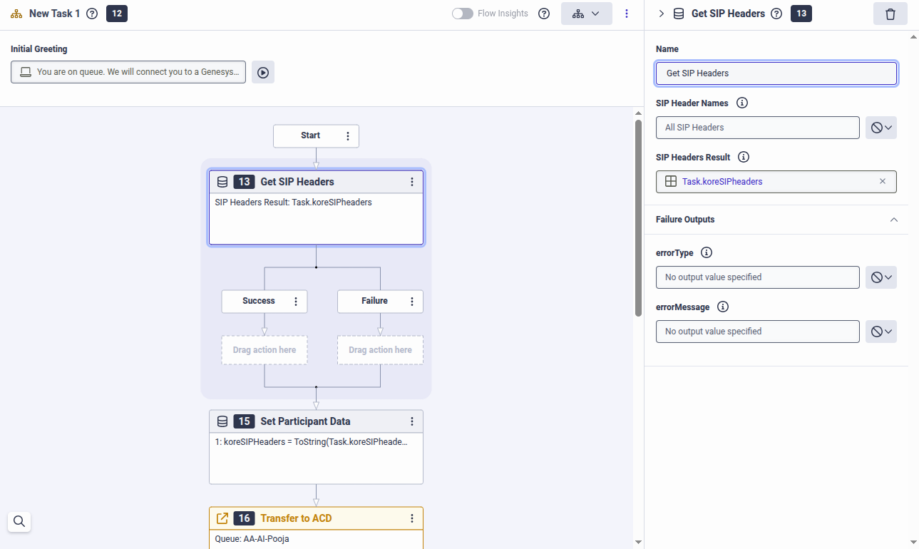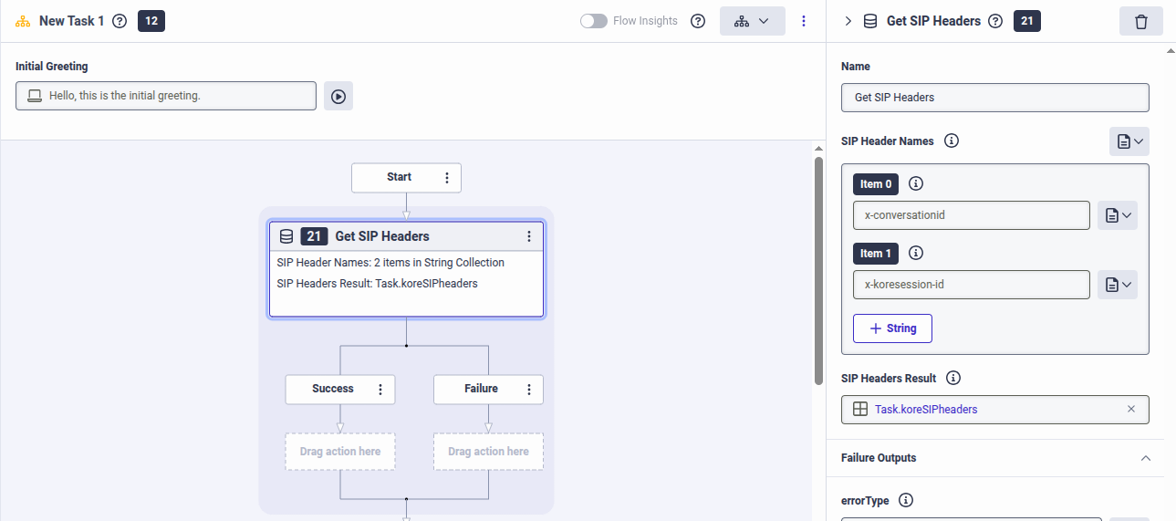 For storing the SIP Headers Result, enter the name as Task.koreSIPheaders: