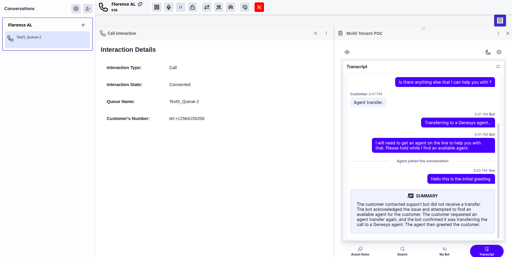 Click the Transcript tab to see the user-bot conversation history and a summary of the same. This tab also displays the real-time transcripts between the live agent and the user.