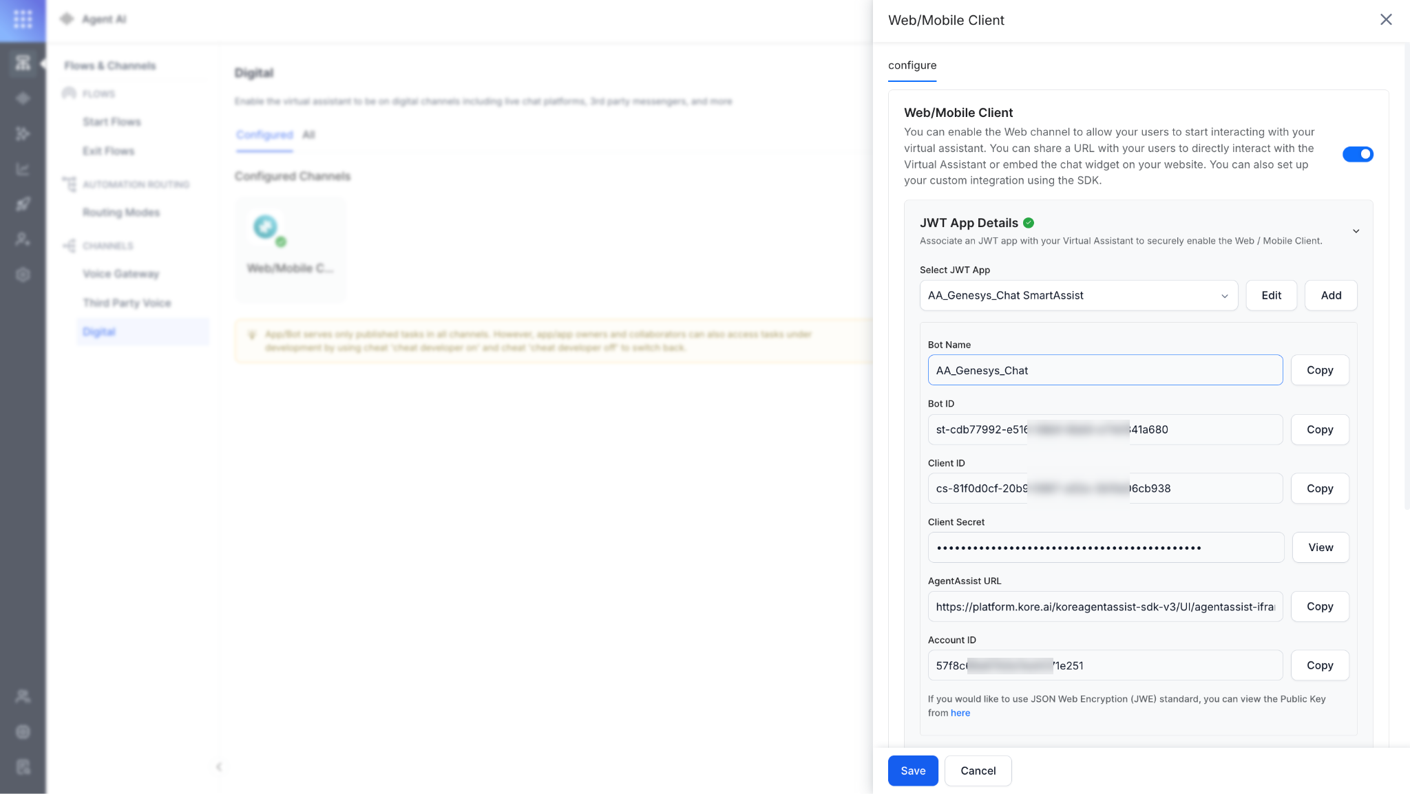 While adding the Agent AI bot credentials in Agent AI Integration with Genesys Cloud CX, make sure to add the details of the bot added in the previous step.