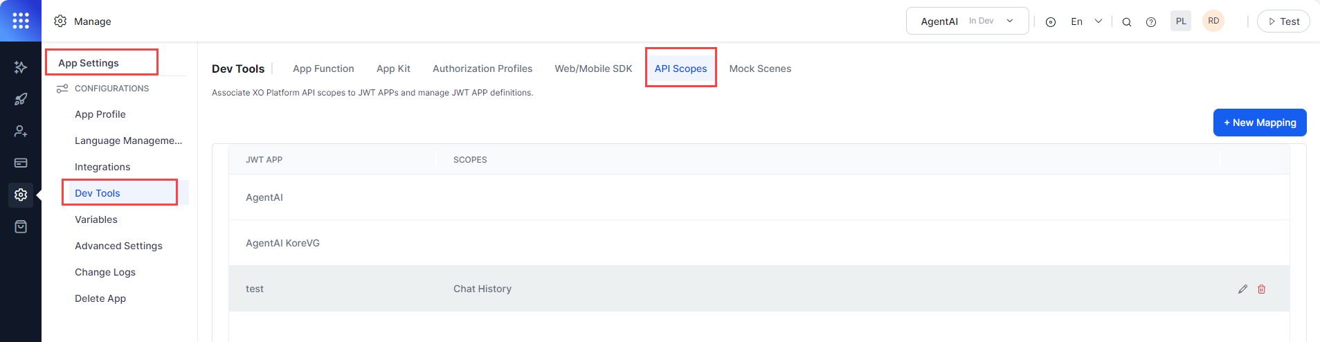 Go to Settings > App Settings > Dev Tools, and click API Scopes.