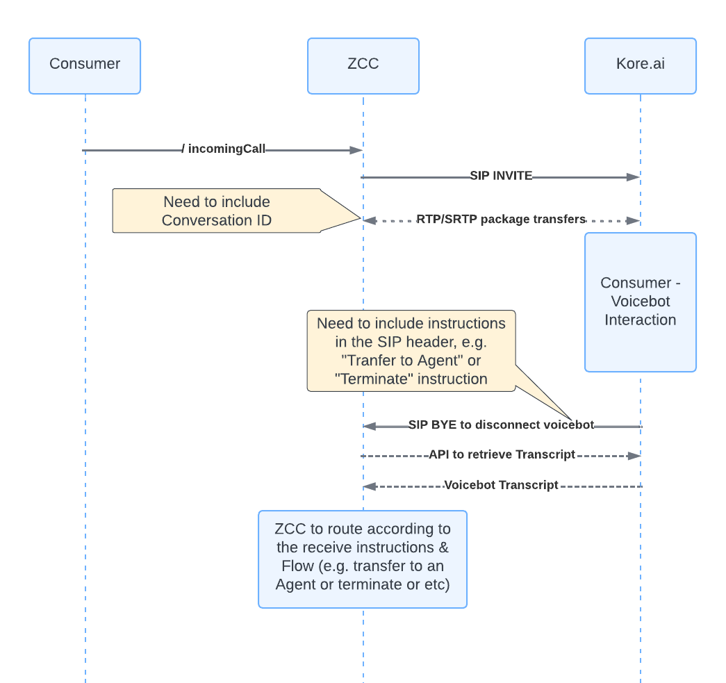 - Routing and Distribution: When a customer initiates contact through ZCC and the call is received by Kore. Admins can use the Agent Transfer Node within the Kore platform to transfer the call back to ZCC if a human agent is required. Admins can also define appropriate SIP headers to provide the necessary information that can be used within ZCC to direct the interaction to the appropriate agents.