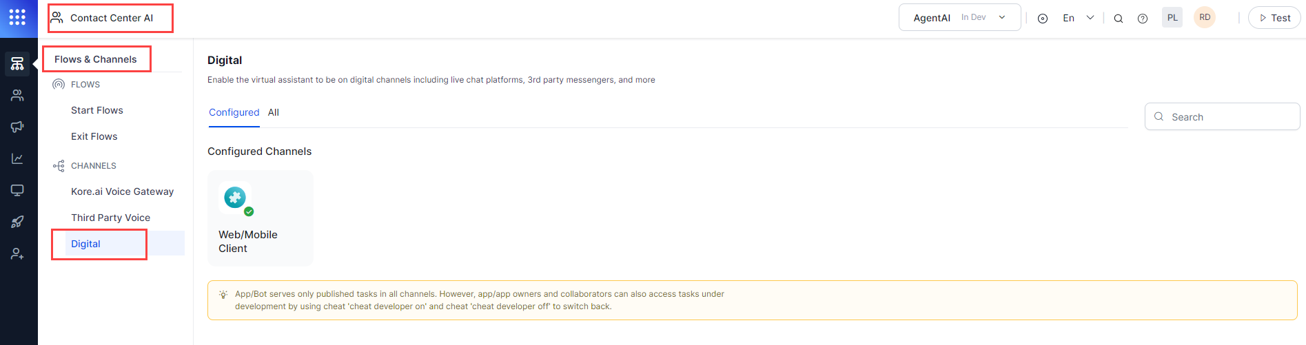 16.1.2 Go to Contact Center AI > Flows & Channels > Digital.
