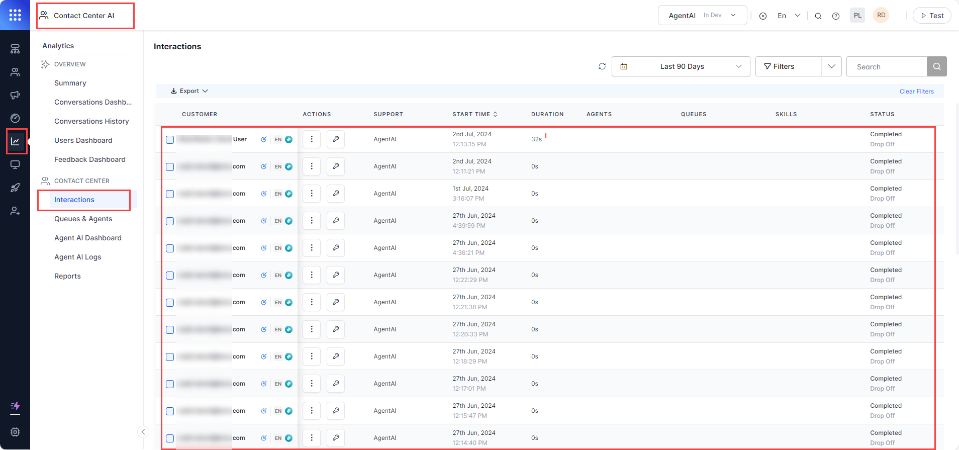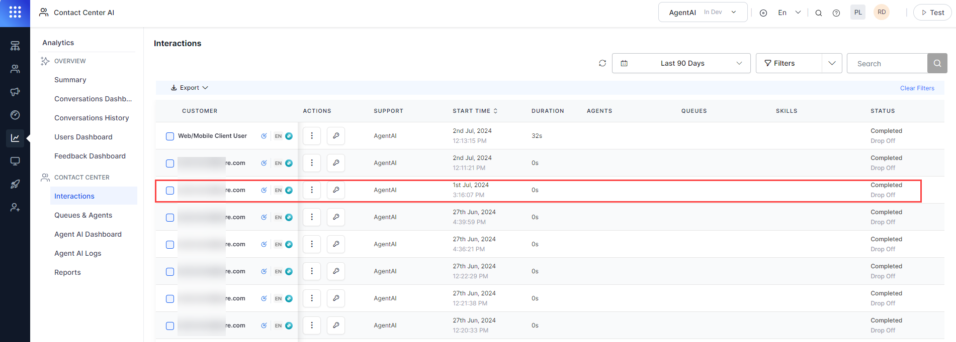 16.2.2 Go to Contact Center AI > Analytics > Contact Center > Interactions.