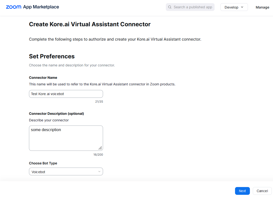 Enter a name in the Connector Name field, select “Voicebot” from the “Choose Bot Type” dropdown list, and then click Next.