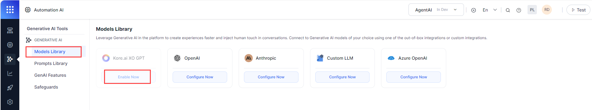 Go to Generative AI > Models Library, locate Kore.ai XO GPT, and click Enable Now.