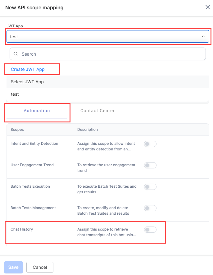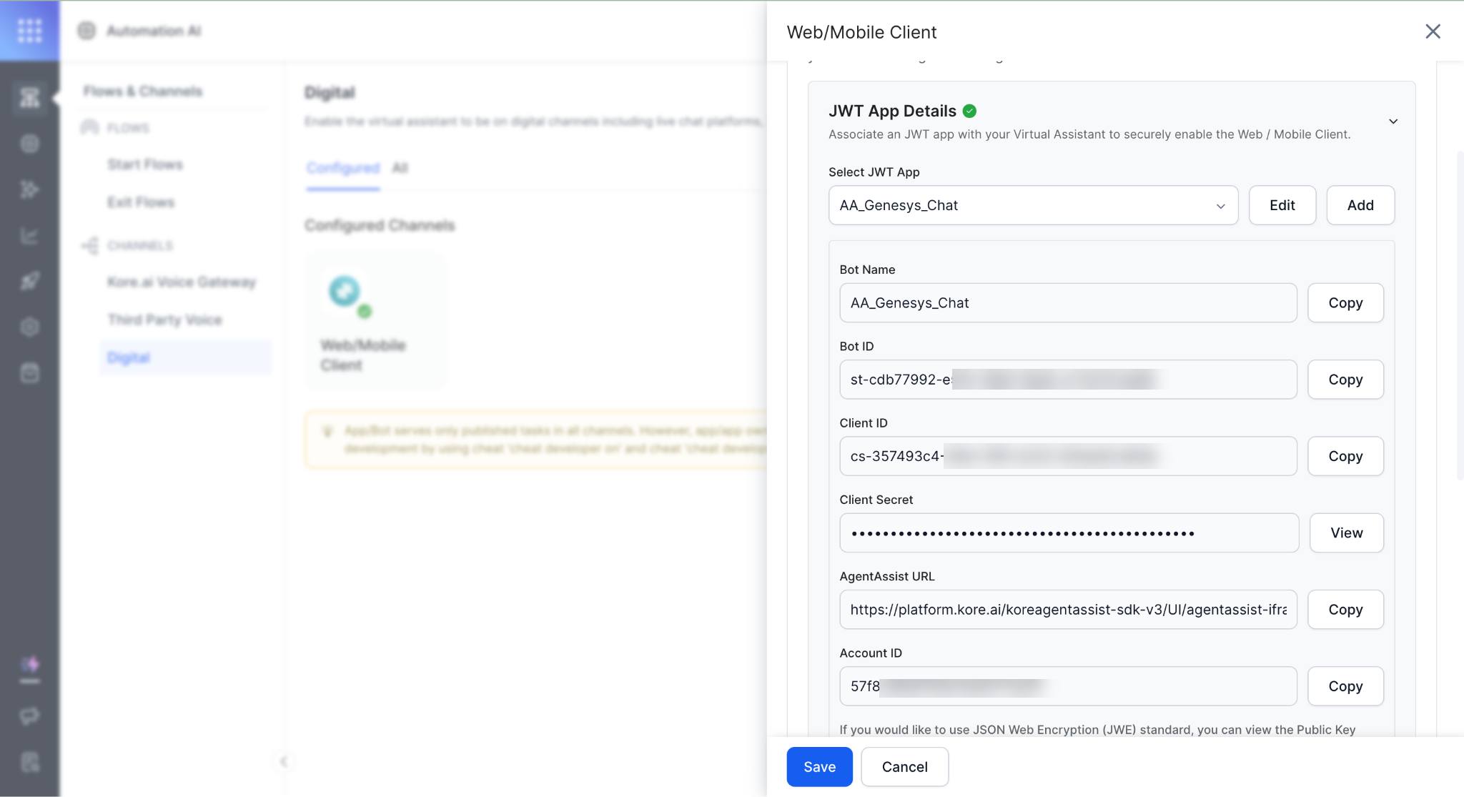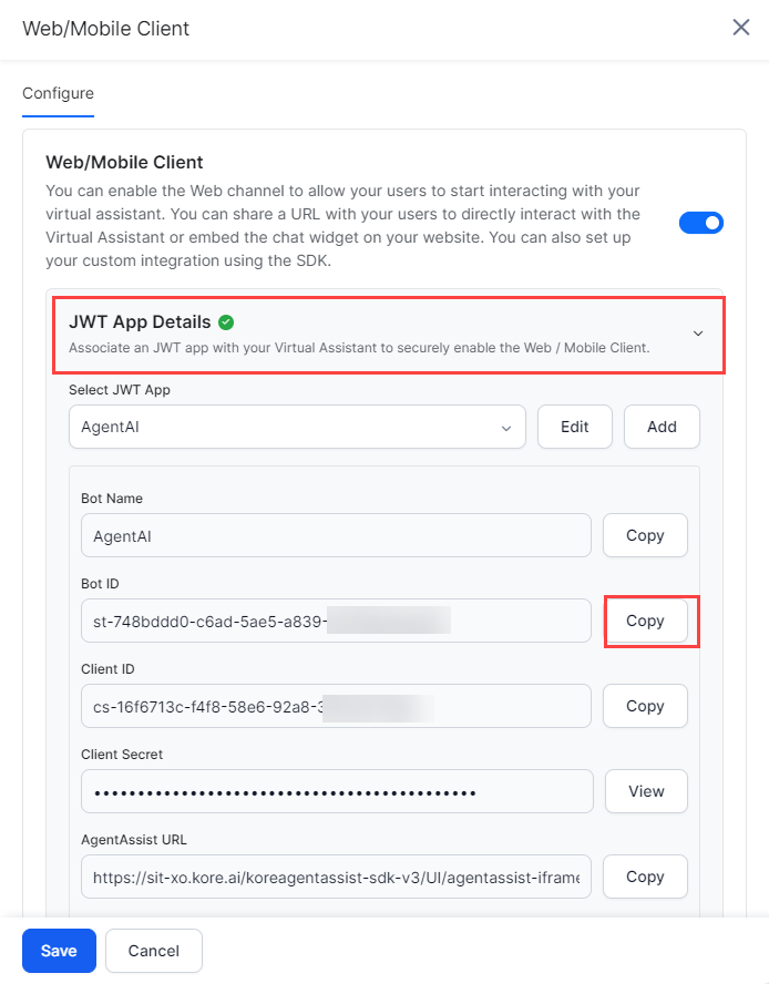 Copy the Bot ID, Client ID, and Client Secret of your respective app on kore.ai. (Go to Flows & Channel > Digital. Under Configured, click Configured Channels > Web/Mobile Client > JWT App Details.)