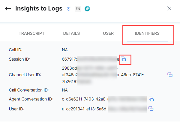 16.2.4 On the Insights to Logs page, click Identifiers, and then click the copy symbol against the Session ID value.