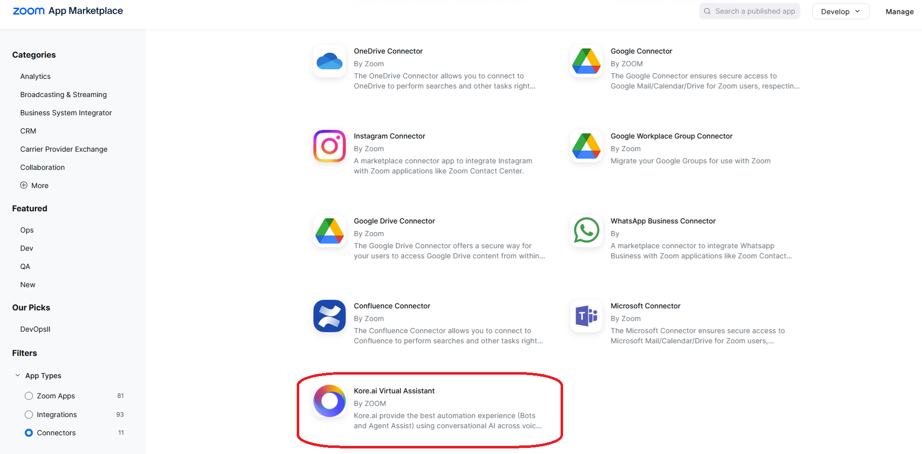 Select App Types > Connectors from the left navigation filter menu, and navigate to the Connectors page, or simply type “kore.ai” in the Search field.