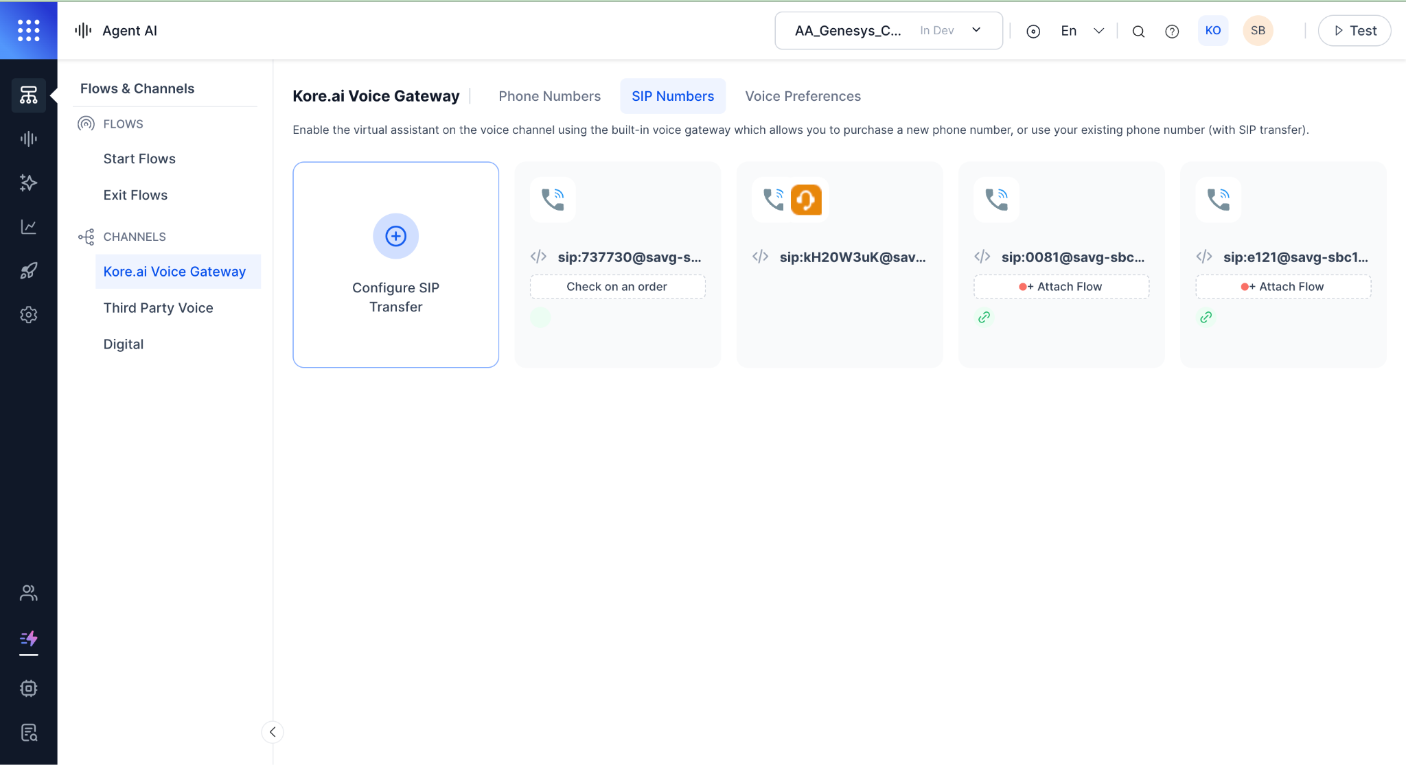 Go to Flows & Channels > Channels > Voice Gateway, and select SIP Numbers > Configure SIP Trunk.