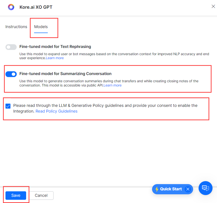 9.3. Please read through the LLM & Generative Policy guidelines and provide your consent to enable the Integration.