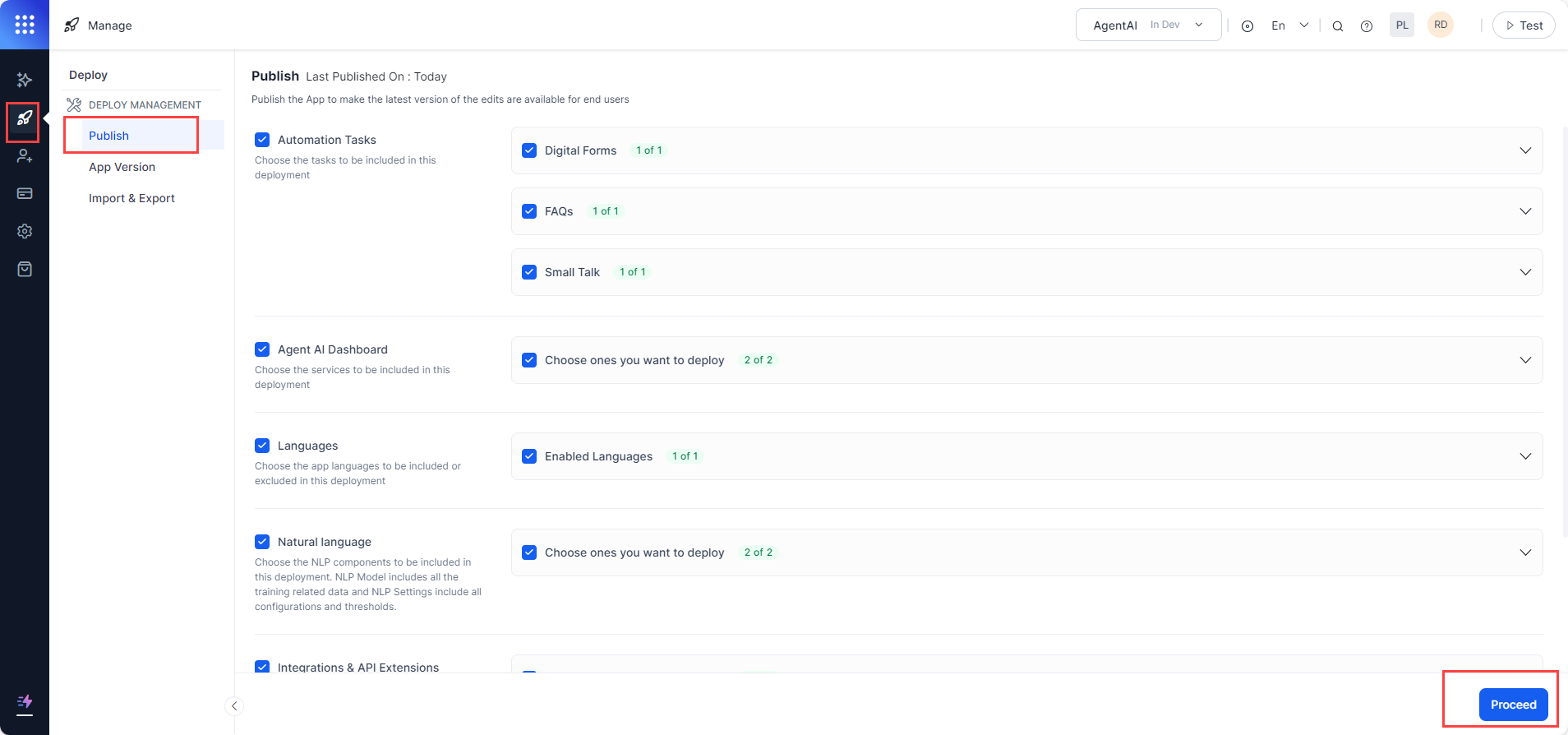 Go to Deploy > Publish and click Proceed to publish your bot.