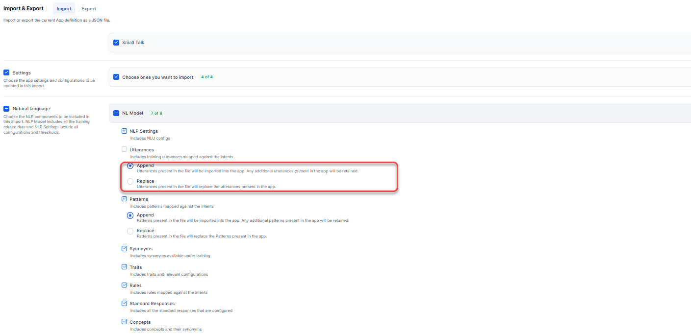 NLP Data: Here you can import Synonyms, Concepts, Traits, Rules, Utterances, Patterns, and Standard Responses. You can choose to either append or replace the ML Utterances and Patterns..