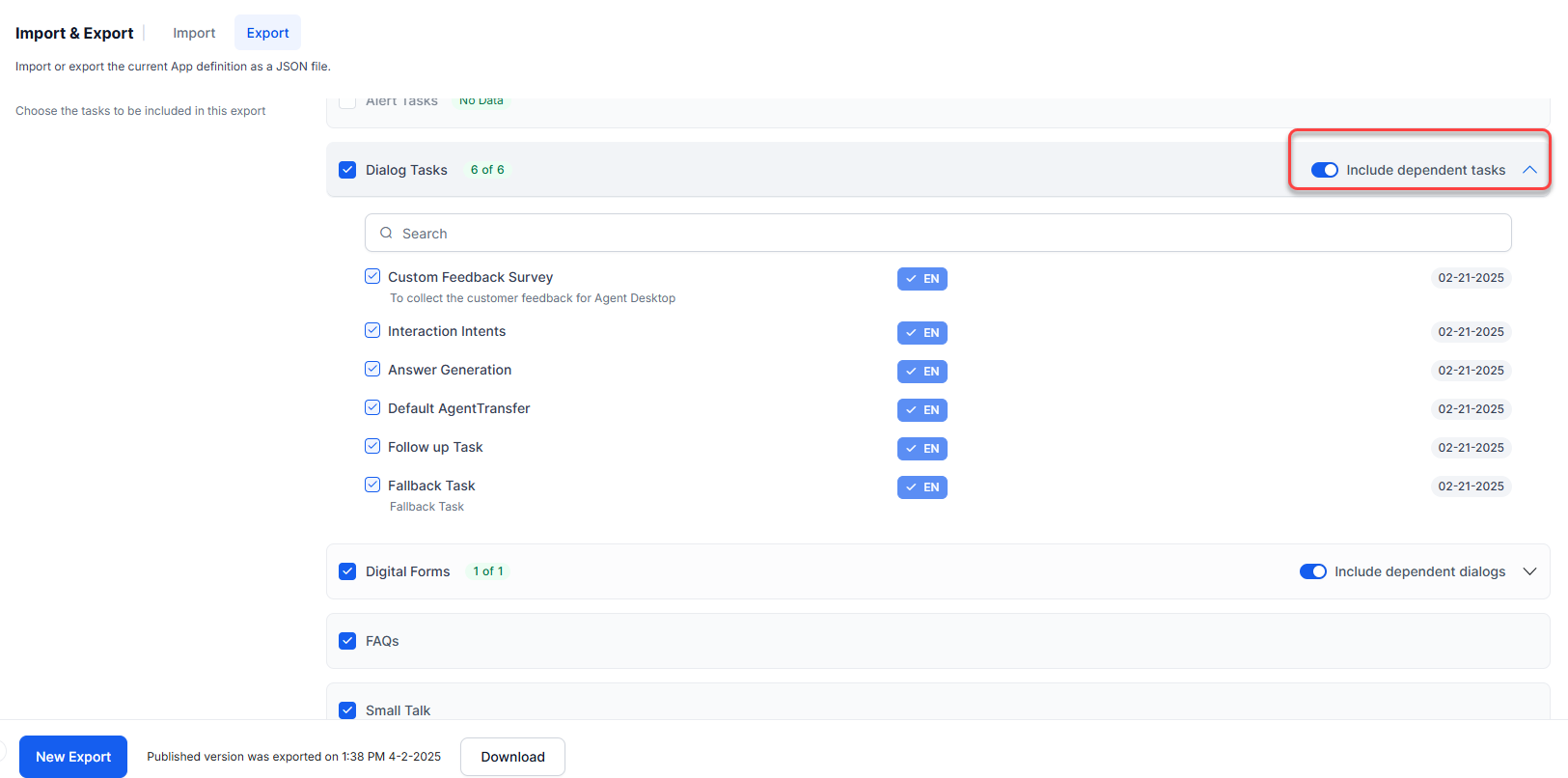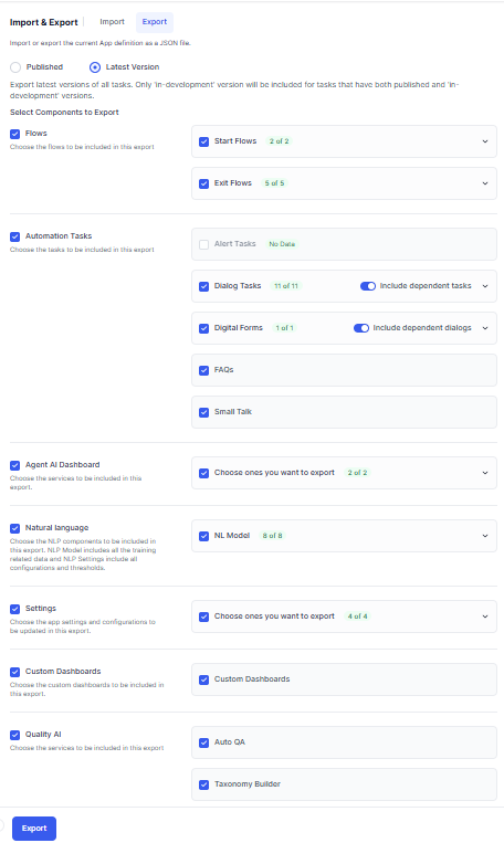 You can export agents in two modes: Published and Latest Version. Depending on the mode that's selected, the corresponding versions of the tasks are exported. You can select specific components to export from the tasks, NLP data, and agent settings in both modes. Further individual Tasks can also be selected.