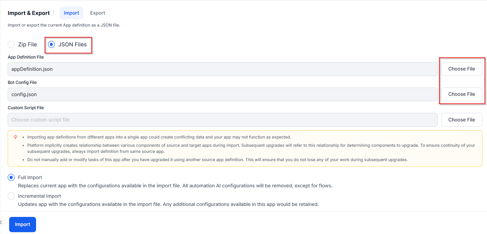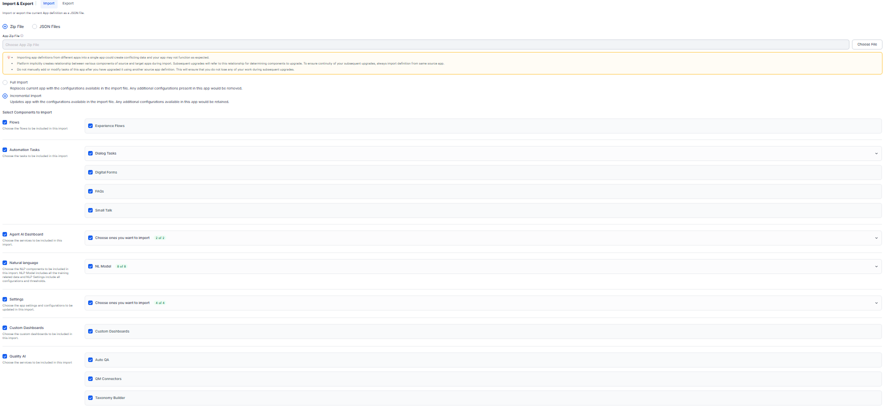 Full import: During a full import, the existing agent components and configurations in Automation AI are replaced with those from the imported file. Any configurations in the target agent that aren't included in the imported file are removed.