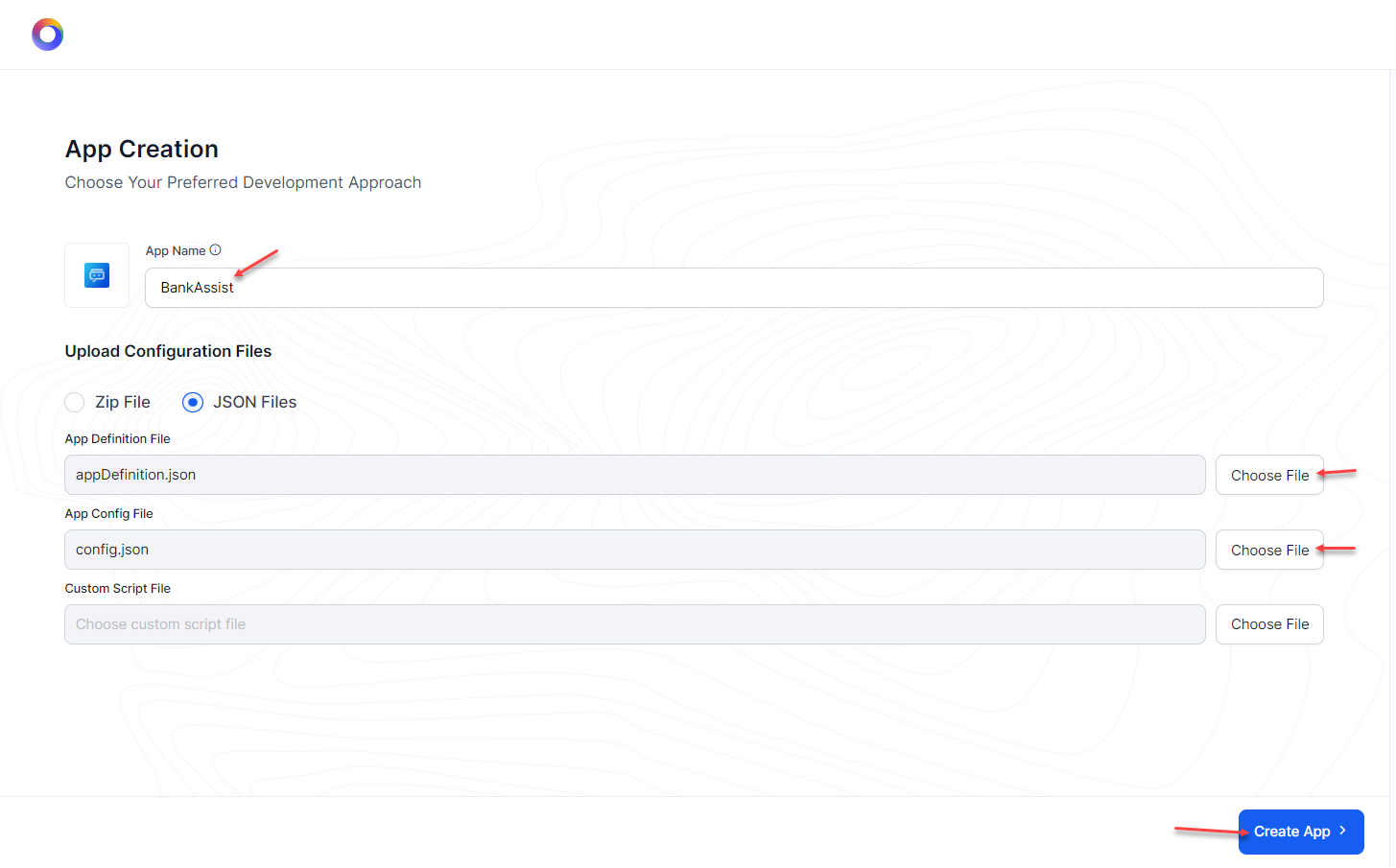 - Click the Choose File buttons next to the App Definition File field and App Config File fields, and upload the appDefinition.json and config.json files, respectively.