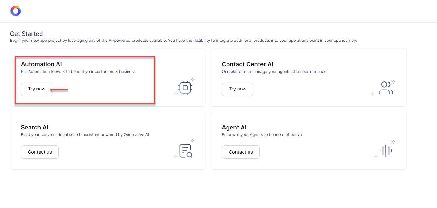 The Get Started screen appears. Select Automation AI by clicking the Try now button on the tile.