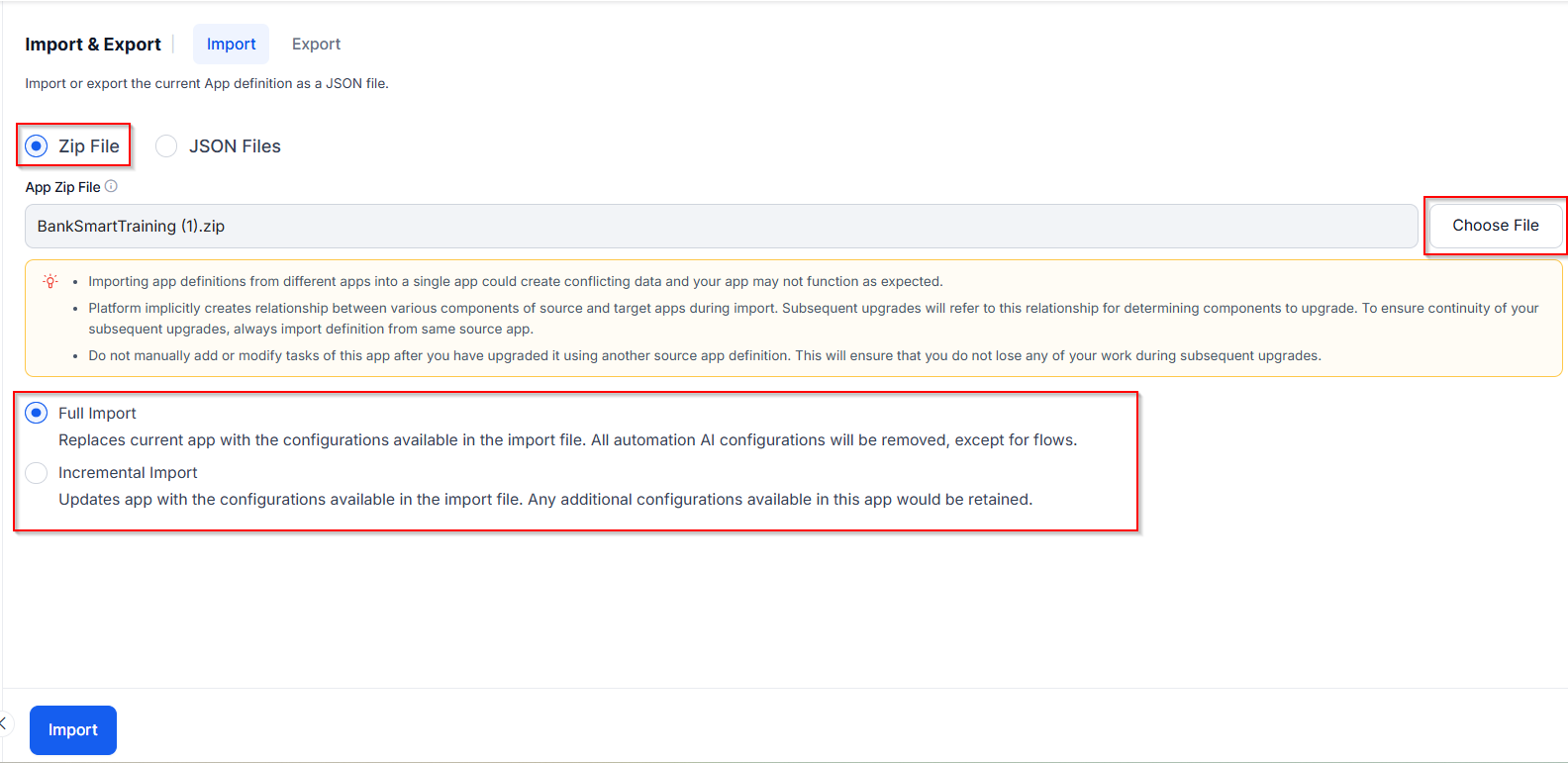 - Through the Choose File button, browse and import the Zip file. Using this option you can import an app by directly importing the zip file created at the time of Export, without having to unzip.