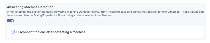 When enabled, the system detects Answering Machine Detection (AMD) from incoming calls and stores the result in context variables available through context.session.UserSession.