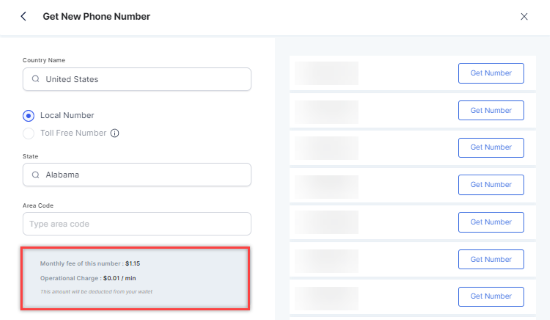 - Once the above fields are configured, the monthly fee and the operational charge per minute are displayed.