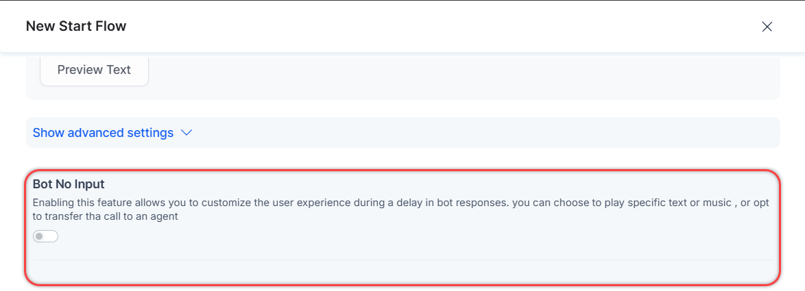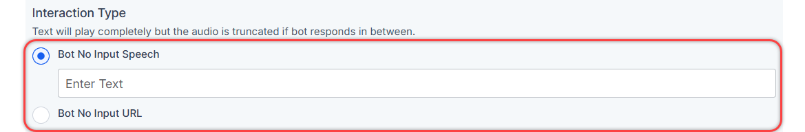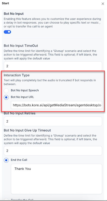 Bot No Input URL: Enter a valid audio URL. The bot will play the audio file from this URL when triggered by the no-input timeout.