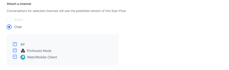 - All: Selecting it selects the Web/Mobile Client and any other services available within your account for the chat flow.