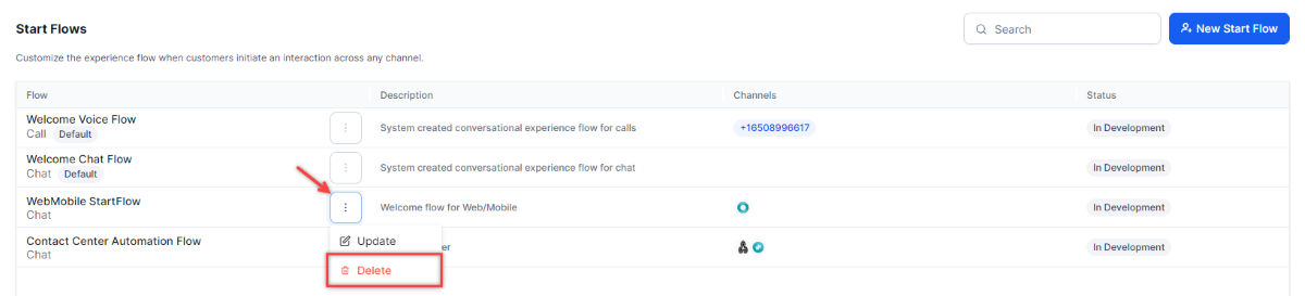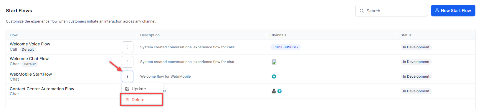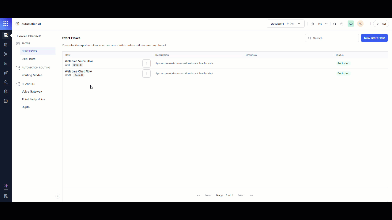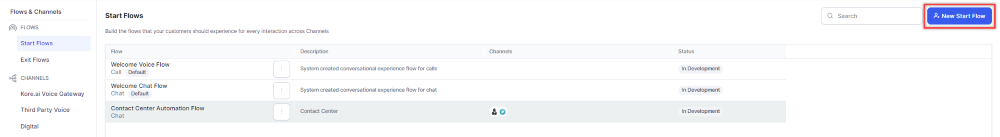 - Start Flows: Most flows are classified as start flows, applicable to both voice and chat channels.