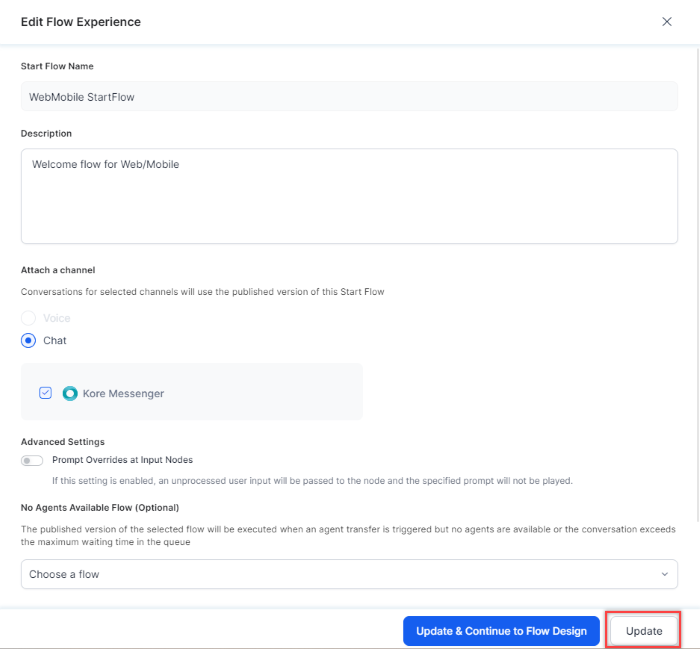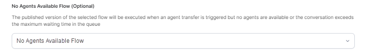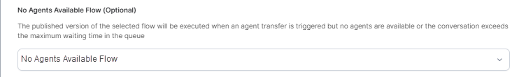 Select a No Agents Available Flow (Optional): The published version of the selected flow will be executed when an agent transfer is triggered, but no agents are available, or the conversation exceeds the maximum waiting time in the queue.