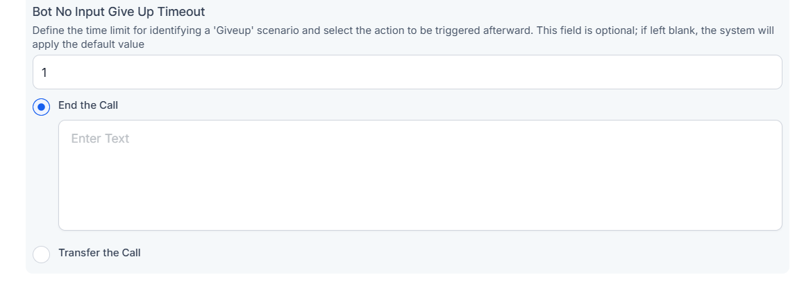 End the Call: Ends the call after the "Bot No Input Give Up Timeout" is reached.