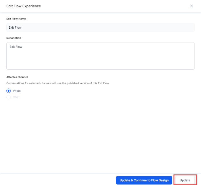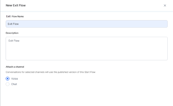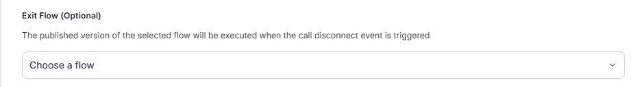 Select an Exit Flow (Optional): When the exit event is triggered, the published version of the selected flow will be executed. You can either select the default Exit Flow or one that you have created yourself.