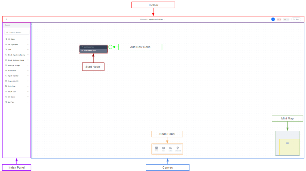 Once you reach the Flow Designer, you can create your flow using the canvas and nodes. The visual guide below gives you an overview of the tools you will be working with.