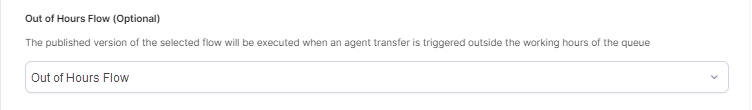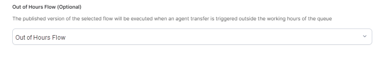 Select an Out-of-Hours Flow (Optional): The published version of the selected flow will be executed when an agent transfer is triggered outside the queue's working hours.