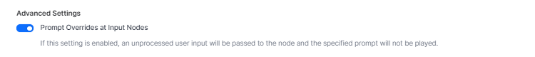 Under Advanced Settings, you can enable Prompt Overrides at Input Nodes. When this feature is enabled, unprocessed user inputs will be passed to the first input node encountered in the flow without returning the actual prompt stored against the input node. This is useful for scenarios where a conversation ends and is then restarted by the user. For example, the user will not see the first “Welcome Message” again, as they would when starting a new conversation. Instead, they will receive a relevant reply to the utterance.